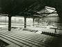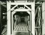 Black and white photographic print of the view through the gallery of the underside of a stage bridge during the remodelling of the Royal Opera House stage, 1900-1901