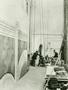 Black and white photographic print of the Paint Shop above the rear of the stage at the Royal Opera House, showing a corner of a backcloth on the small paint frame