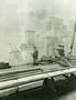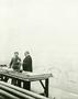 Black and white photographic print of the new grid with two operators during the remodelling of the Royal Opera House stage, 1900-1901