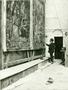 Black and white photographic print of the Paint Shop and three scenic artists working on the backcloth for a production of 'Aida' at the Royal Opera House
